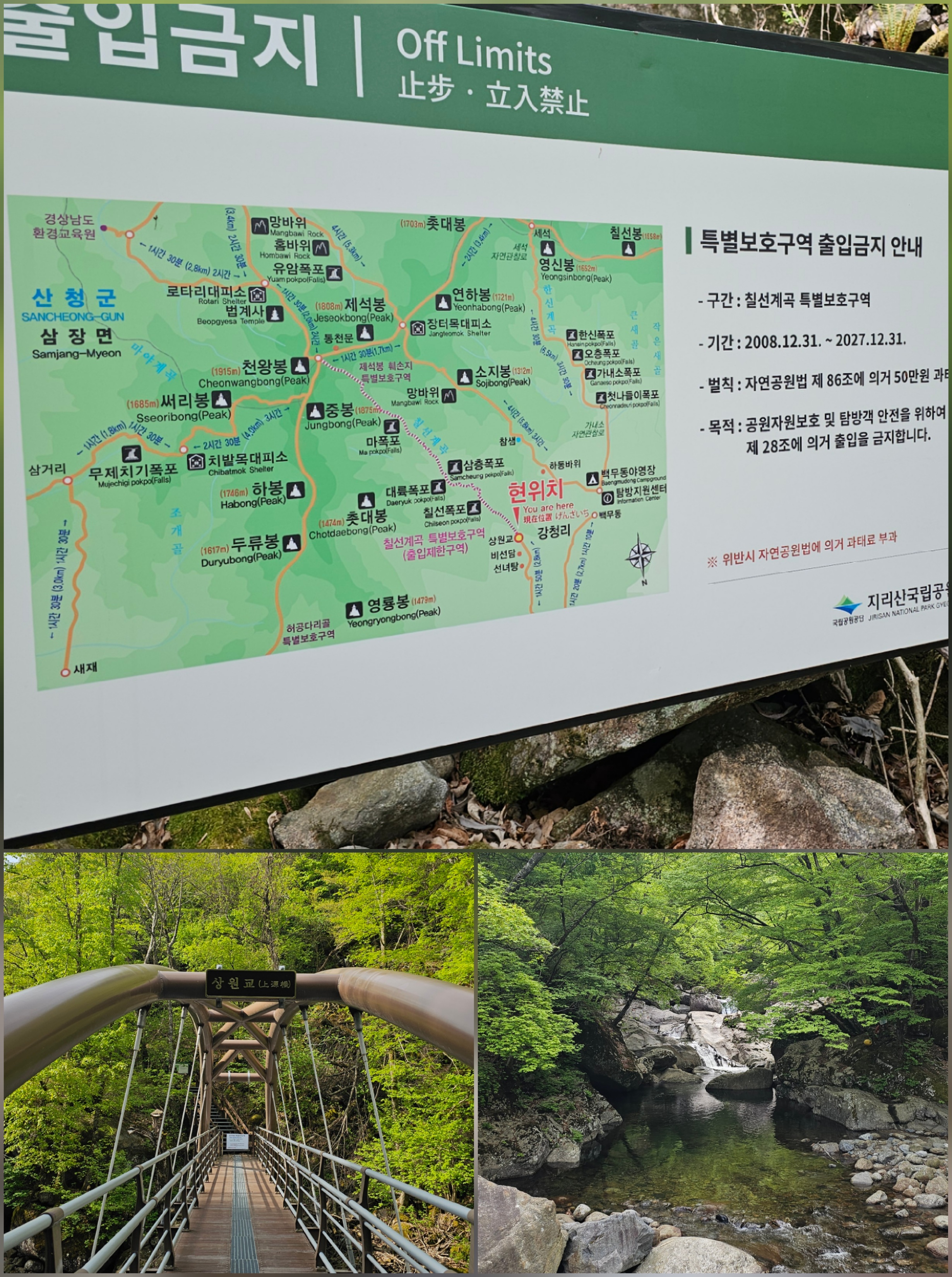 상원교에서는 국립공원에서 준 노란띠가 없으면 지나갈 수가 없다.