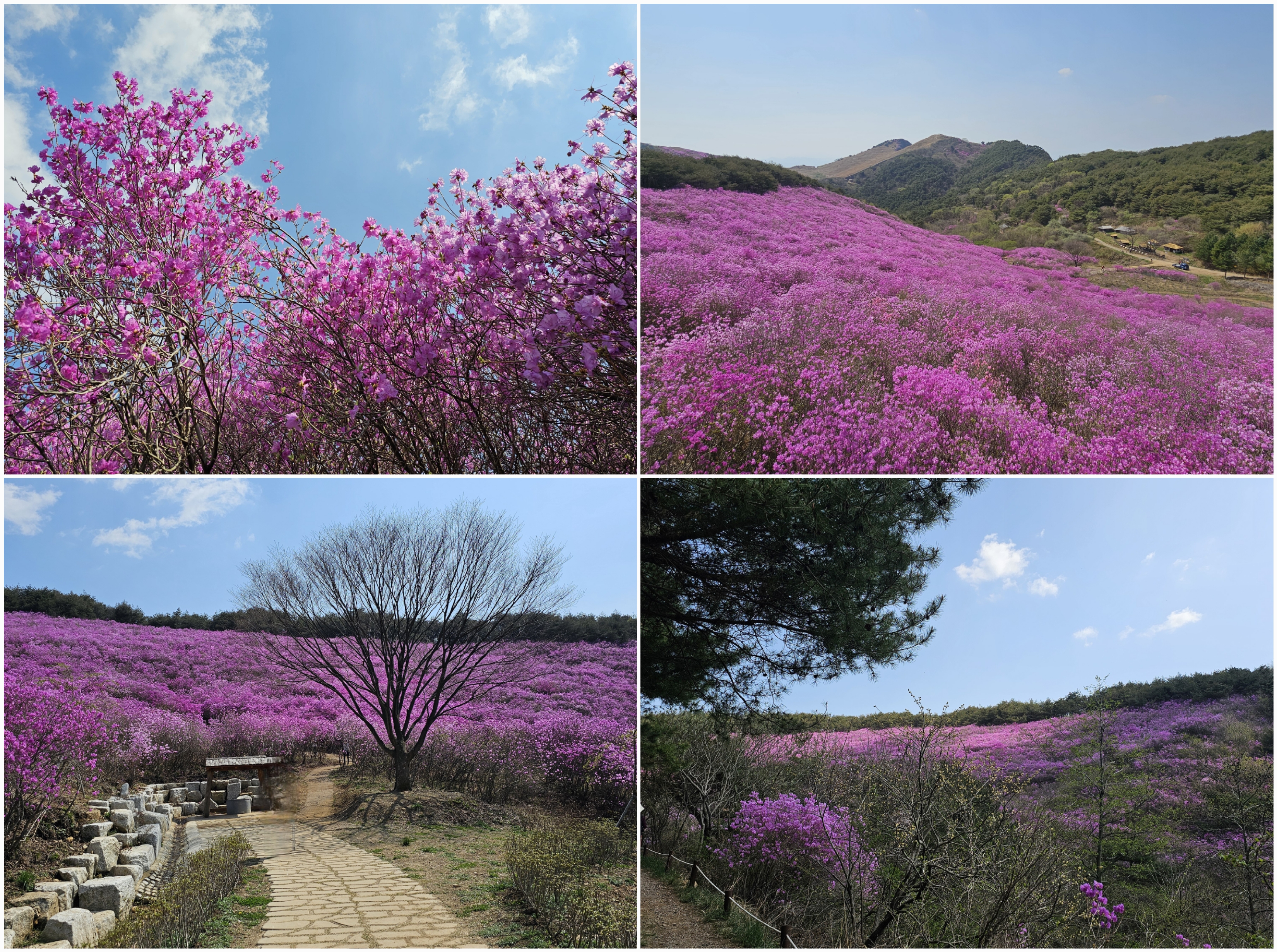 드디어 군락지에 도착했습니다. 꽃이 정말 많았습니다. 이 사이에서 마음껏 사진을 찍을 수 있을 것 같습니다. 여기가 포토존이군요^^ 아! 이 앞에 허준 촬영장이 있는데 그곳에서 사람들이 밥을 먹고 있습니다. 전망대 위에서 바라본 진달래는 정말 화려했습니다. 보라색인가요? 핑크색인가요?🌸🌸🌺🌺