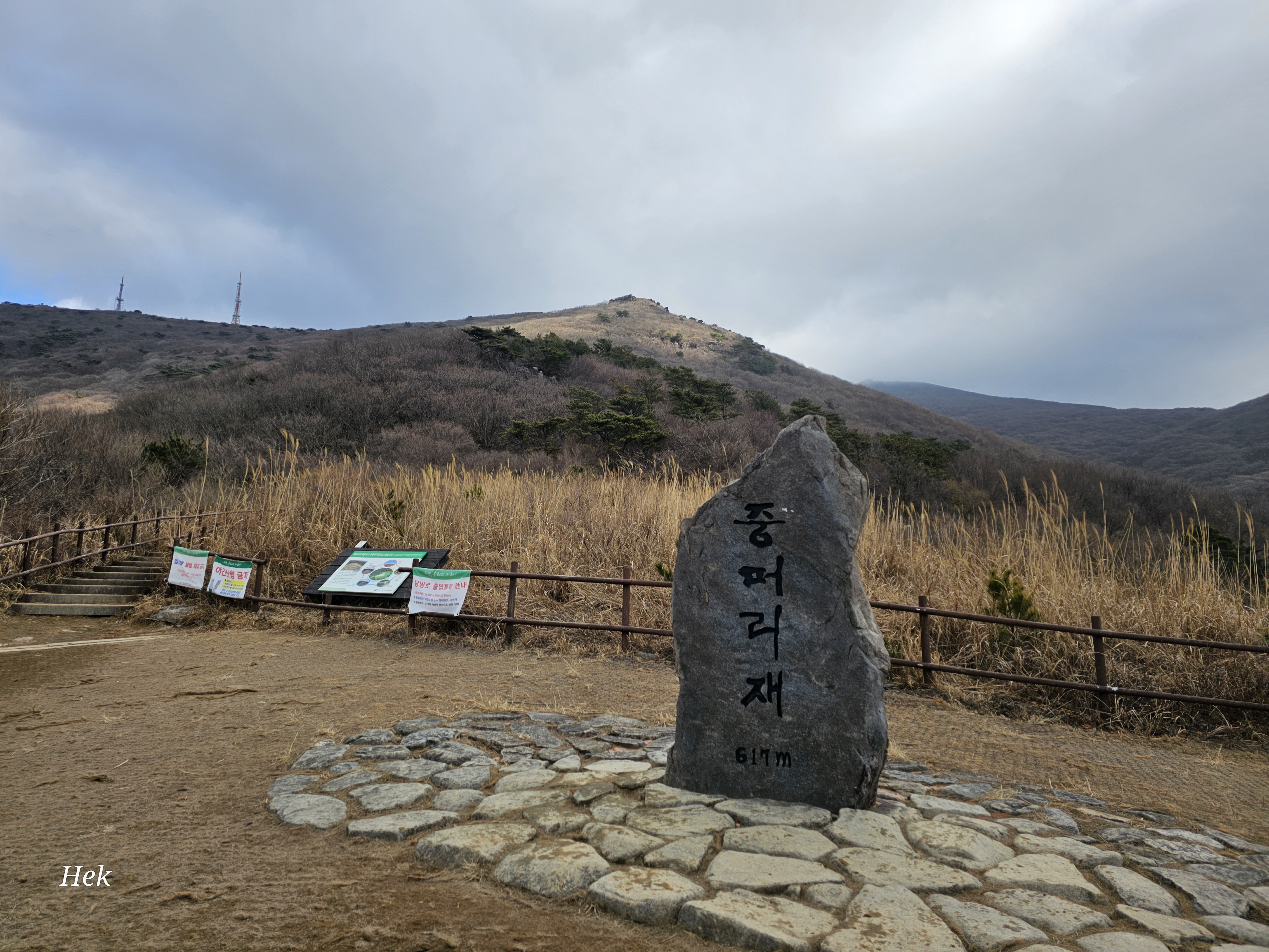 중머리재에서 올라오면 '장불재'에 도착한다. 저 뒤에 보이는 바위가 입석대, 서석대이다. 이 비석 뒤로 마지막 걸음을 옮긴다. 올라가면 제일 처음 만나는 입석대에 사진 찍기 위해 사람들이 너무 많다. 그렇기에 나는 직진한다. (사실 20m 만 올라가면 되지만 계단이기에 패스)