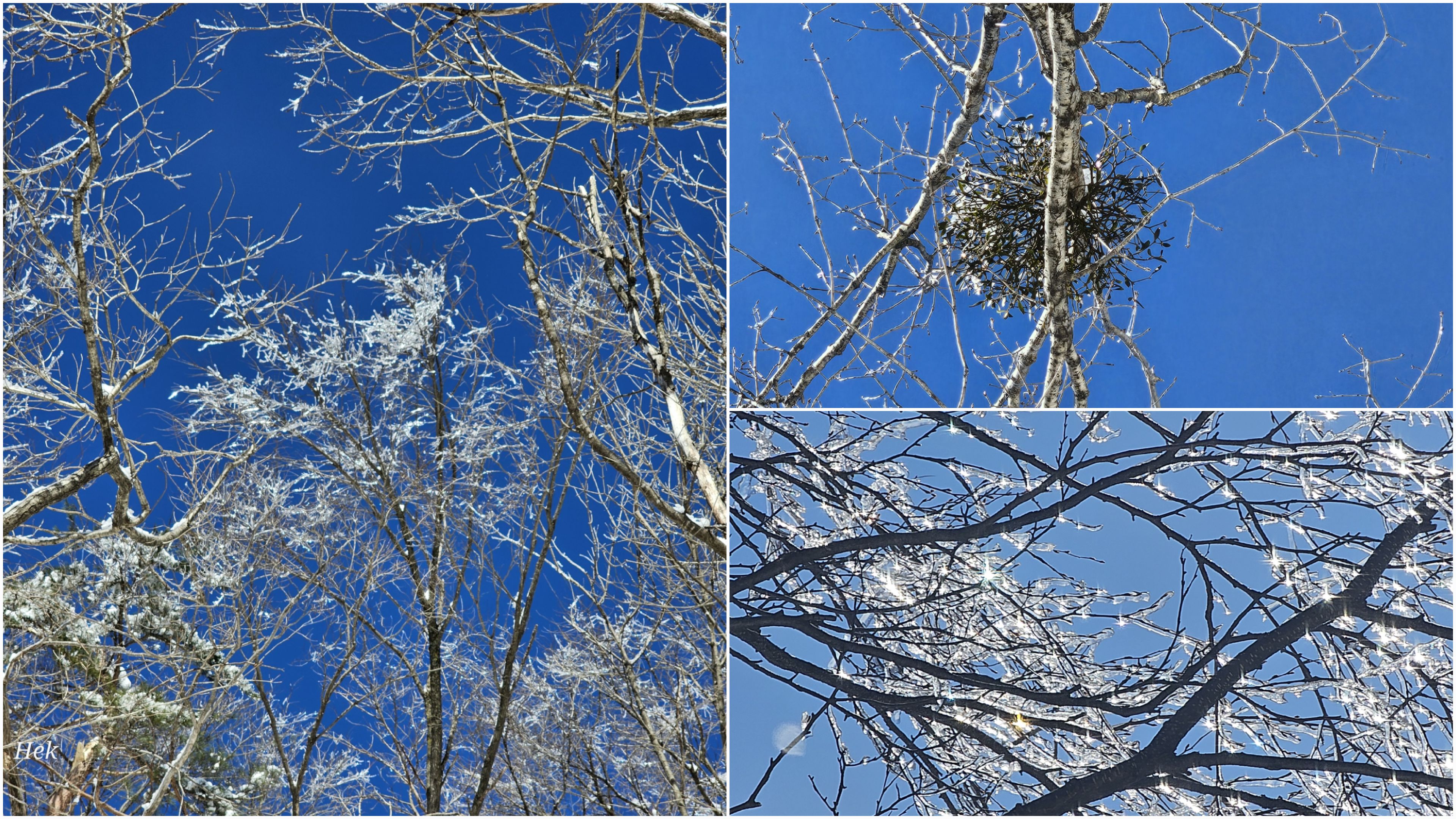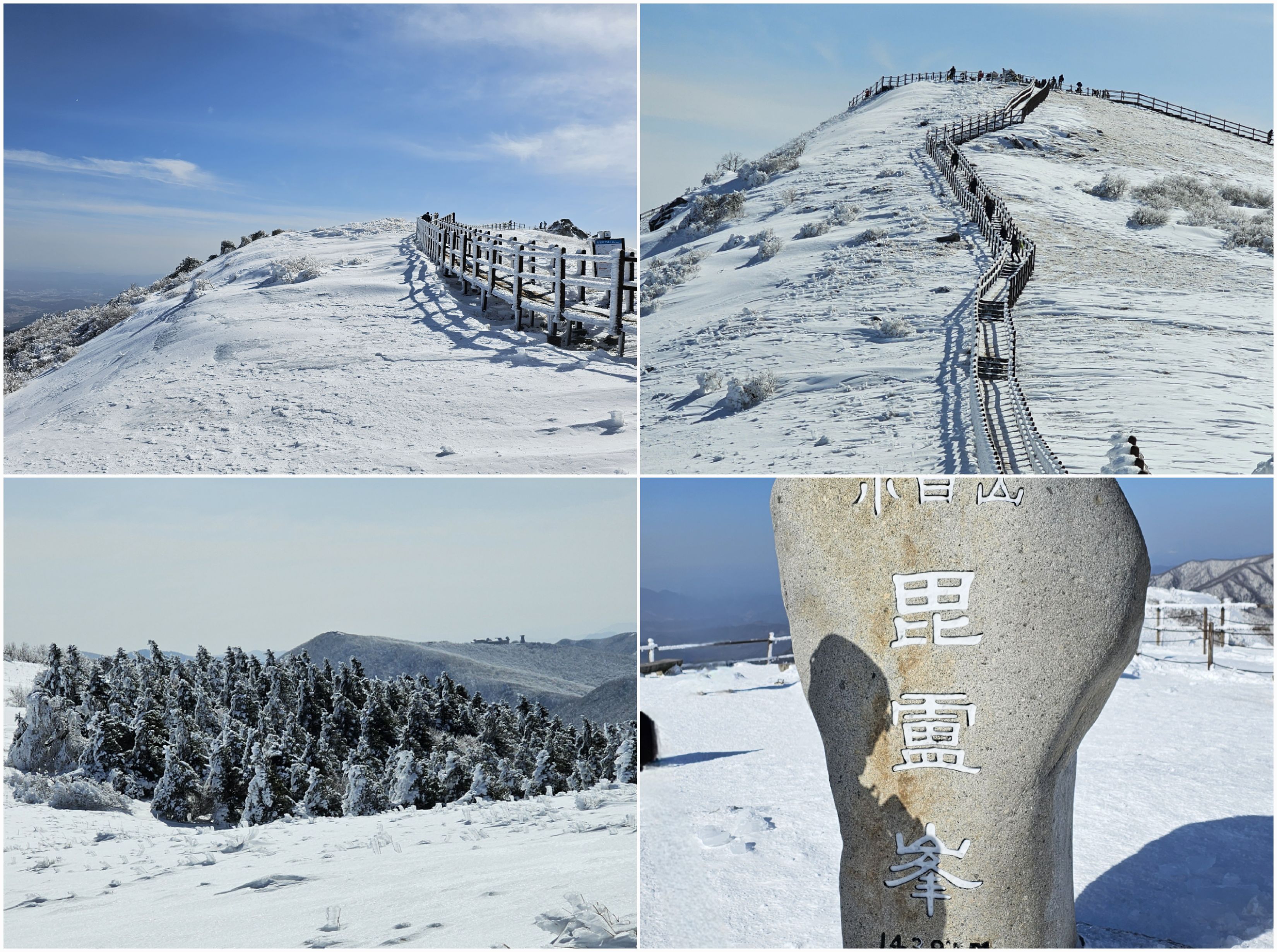 우린 일부러 눈을 보기 위해 날씨를 보고 갔다. 그래서 하늘이 쨍쨍했고 어딜 봐도 풍경이 정말 이뻤다. 중간중간 고드름도 보이고 계곡에 물도 엄청 흐른다. 눈산은 흐린 날의 눈보단, 맑은 날의 눈 조합이 정말 이쁜 것 같다. 올라가는 길에 전망대가 나오고 그곳에 나무들이 얼어서 빛을 받아 유리구슬처럼 반짝반짝했다. 그것이 상고대이다.