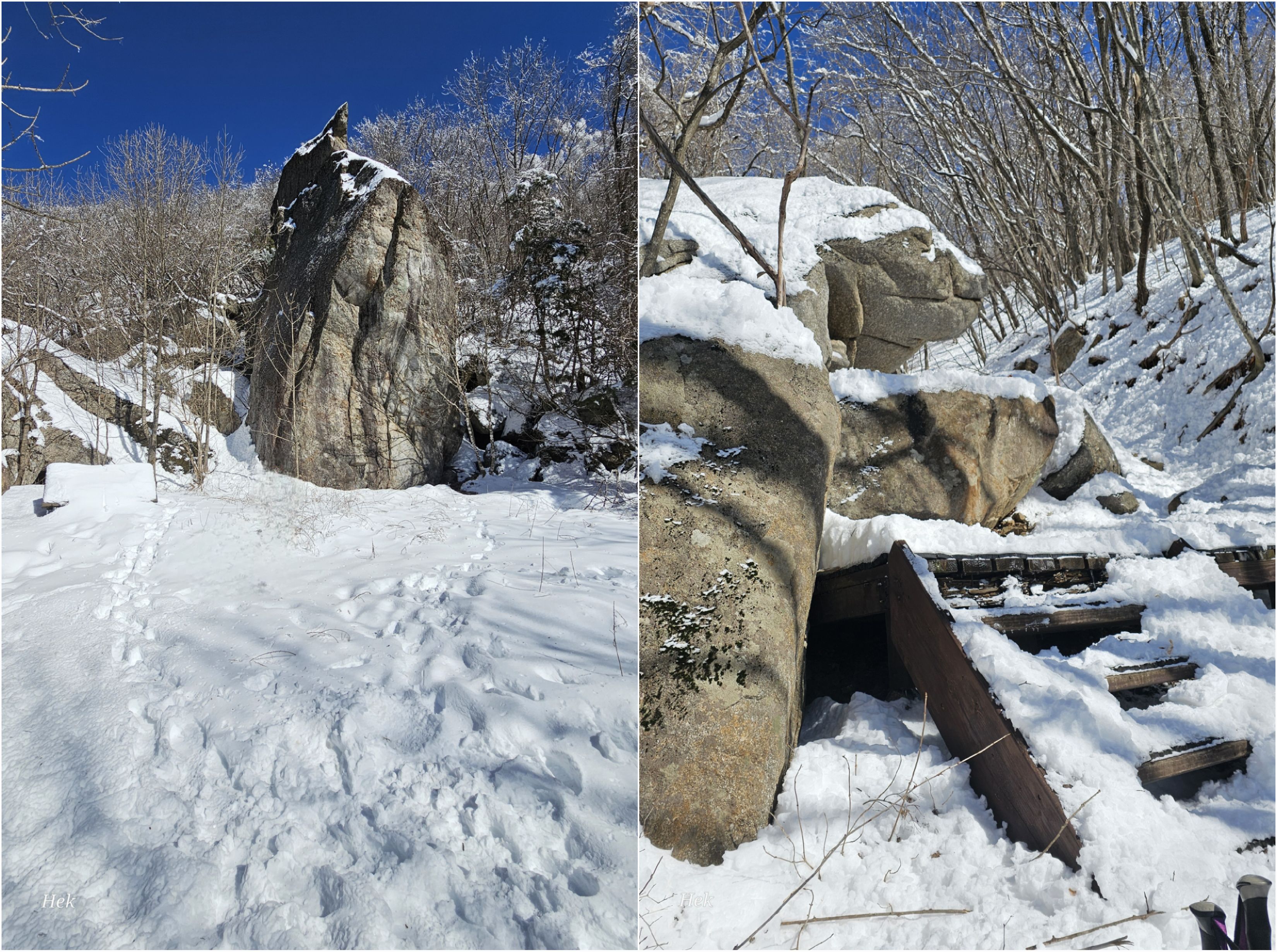 저 상고대가 반짝이는건 정말 실물로 한번 봐야 한다. 너무 이뻐서 미칠 수도? 하지만 봉두암까지는 다 왔다. 하지만 돼지바위를 지나는 순간 계단 지옥이며 길은 오르막이 시작되며 힘들어지기 시작한다.