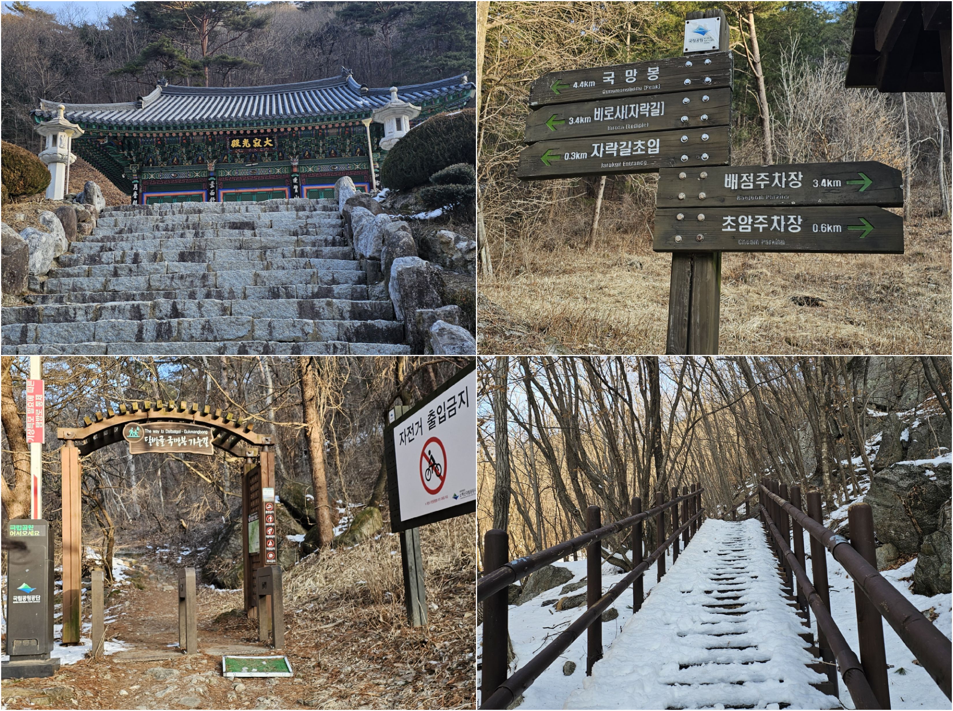 초암사로 올라가는 임도길을 따라 올라가면 절이 나오며 등산로 입구 또한 보인다. 그럼 등산을 할 준비를 마쳤다면 산을 탄다. 입구에는 아직까지 난이도가 괜찮다. 하지만 올라가면 갈수록 계단들이 나타나기 시작한다.